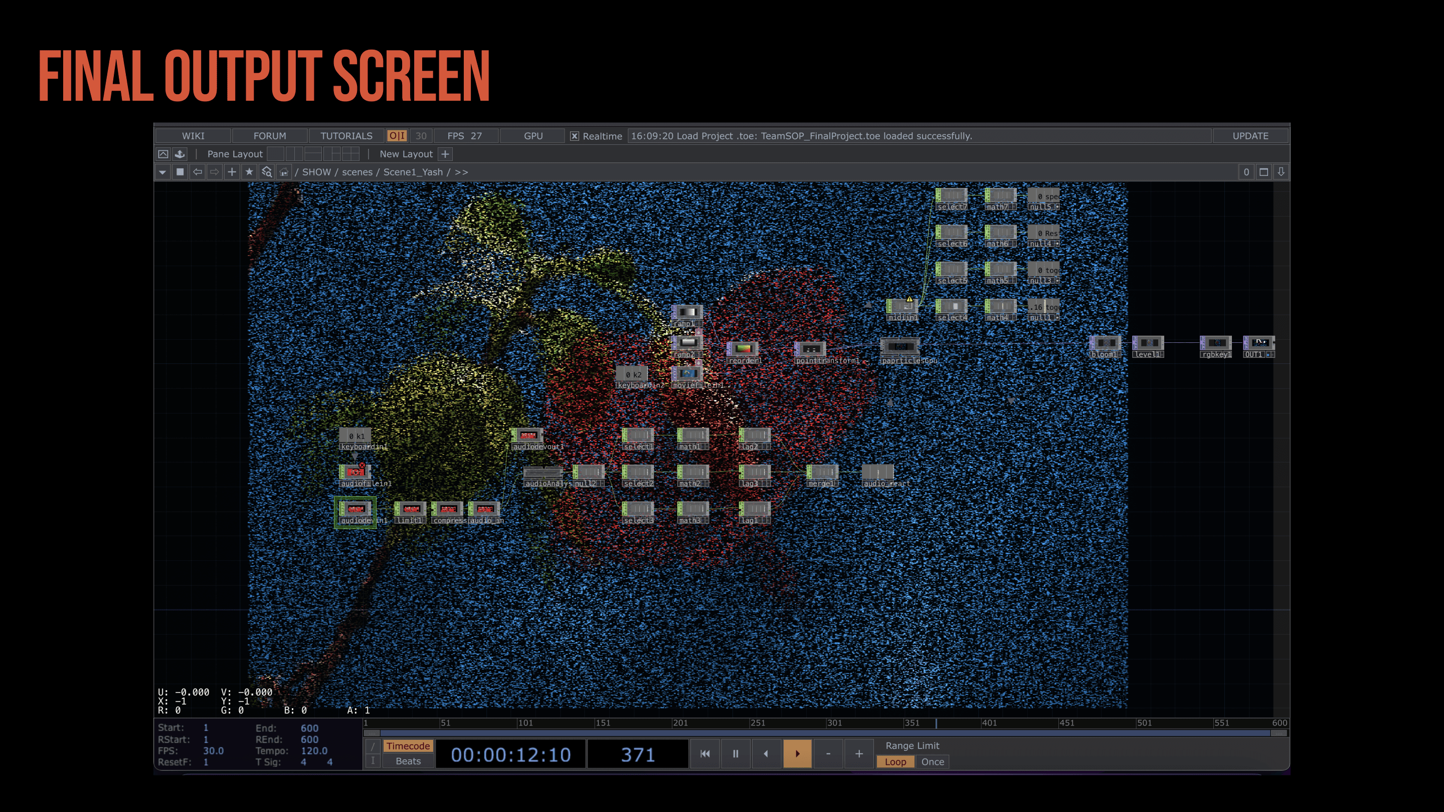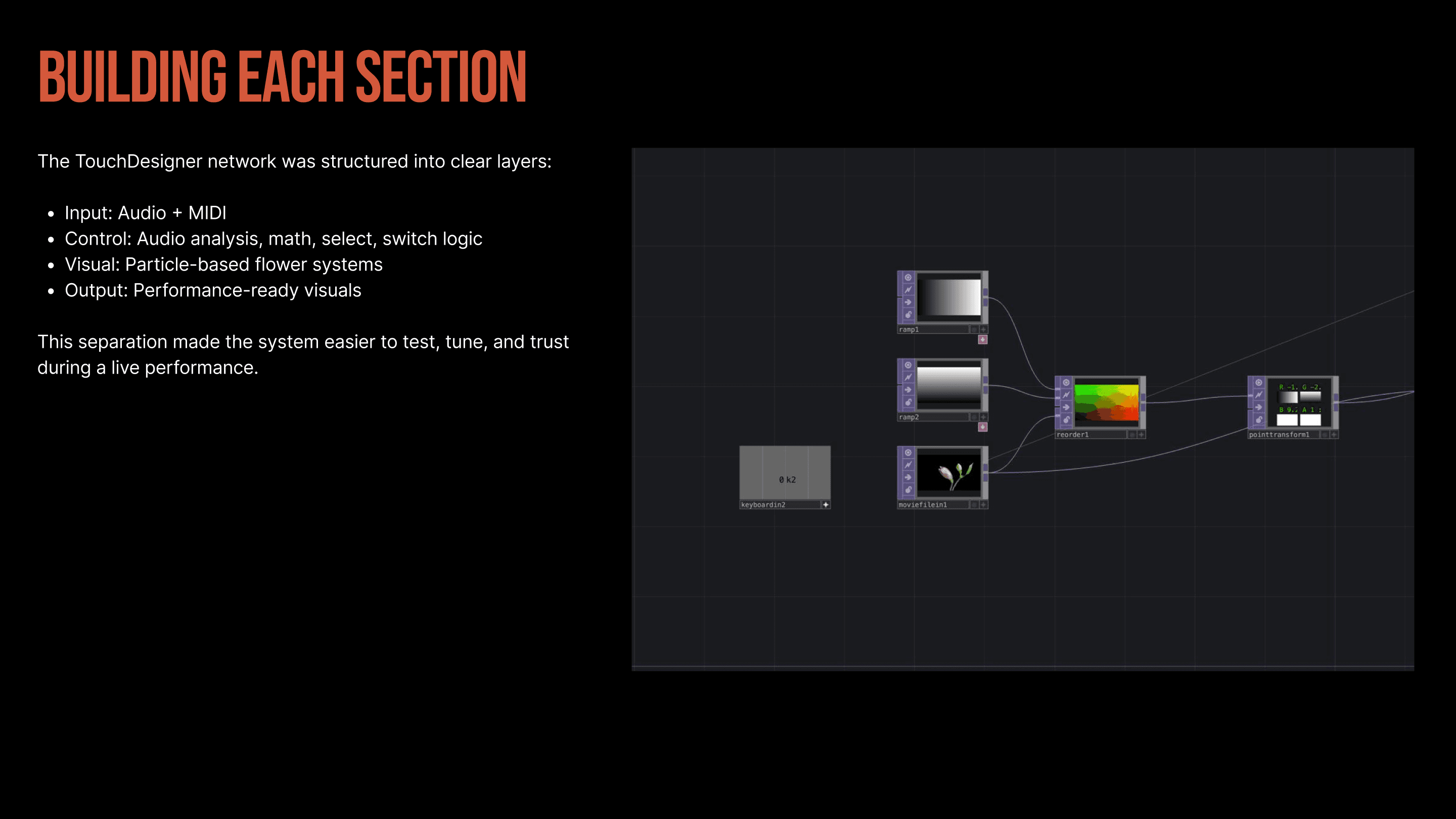 Touch Designer, Interaction Design, Audio Reactivity, Particle Systems, Generative Visuals, Python, MIDI Control, Real-Time Systems, Live Performance.