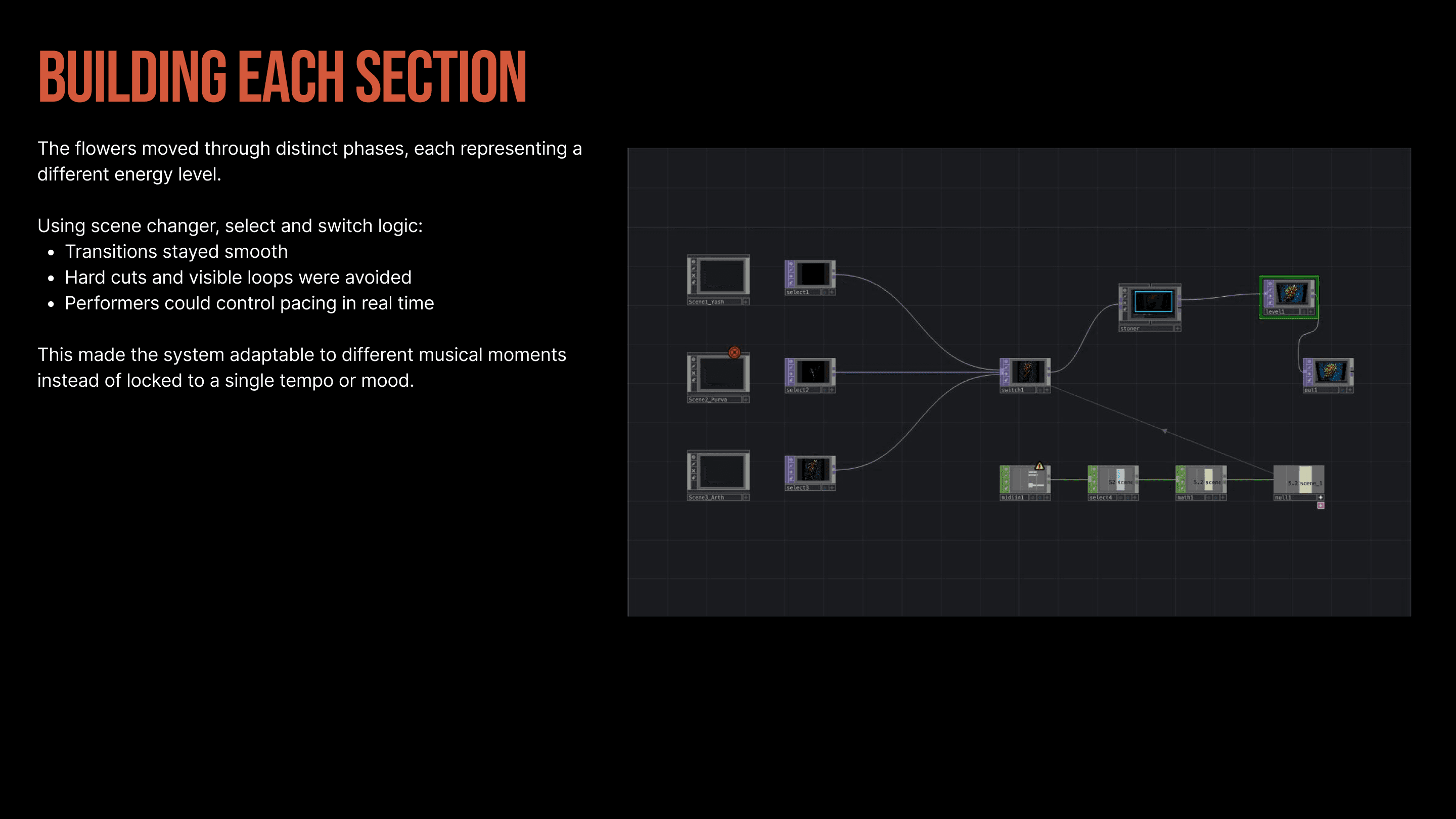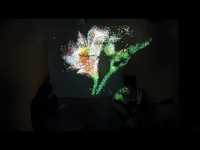 We built an audio-reactive flower installation where three flower visuals evolve through distinct phases and respond in real time to music. Using TouchDesigner, particle systems, MIDI controls, and audio analysis (including kicks and snares), the installation was designed as a living visual system rather than a pre-rendered animation.